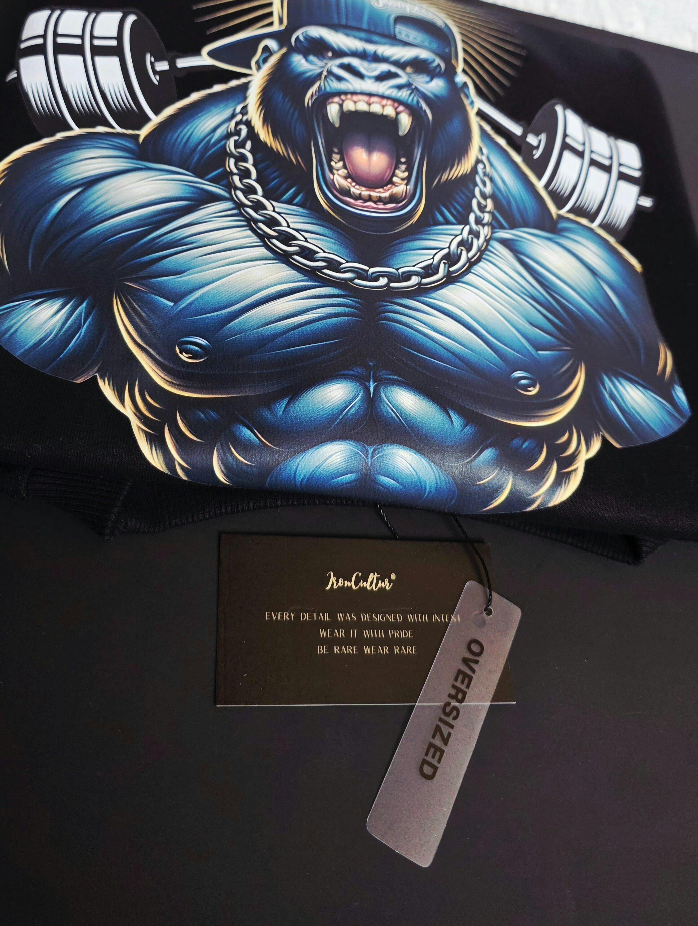 Großes Rückendruckmotiv: ein muskulöser Gorilla in Kampfstimmung, mit Gold-Chain, Cap und geballter Energie – unterlegt mit „BEAST MODE“ in typografischer Stärke.
