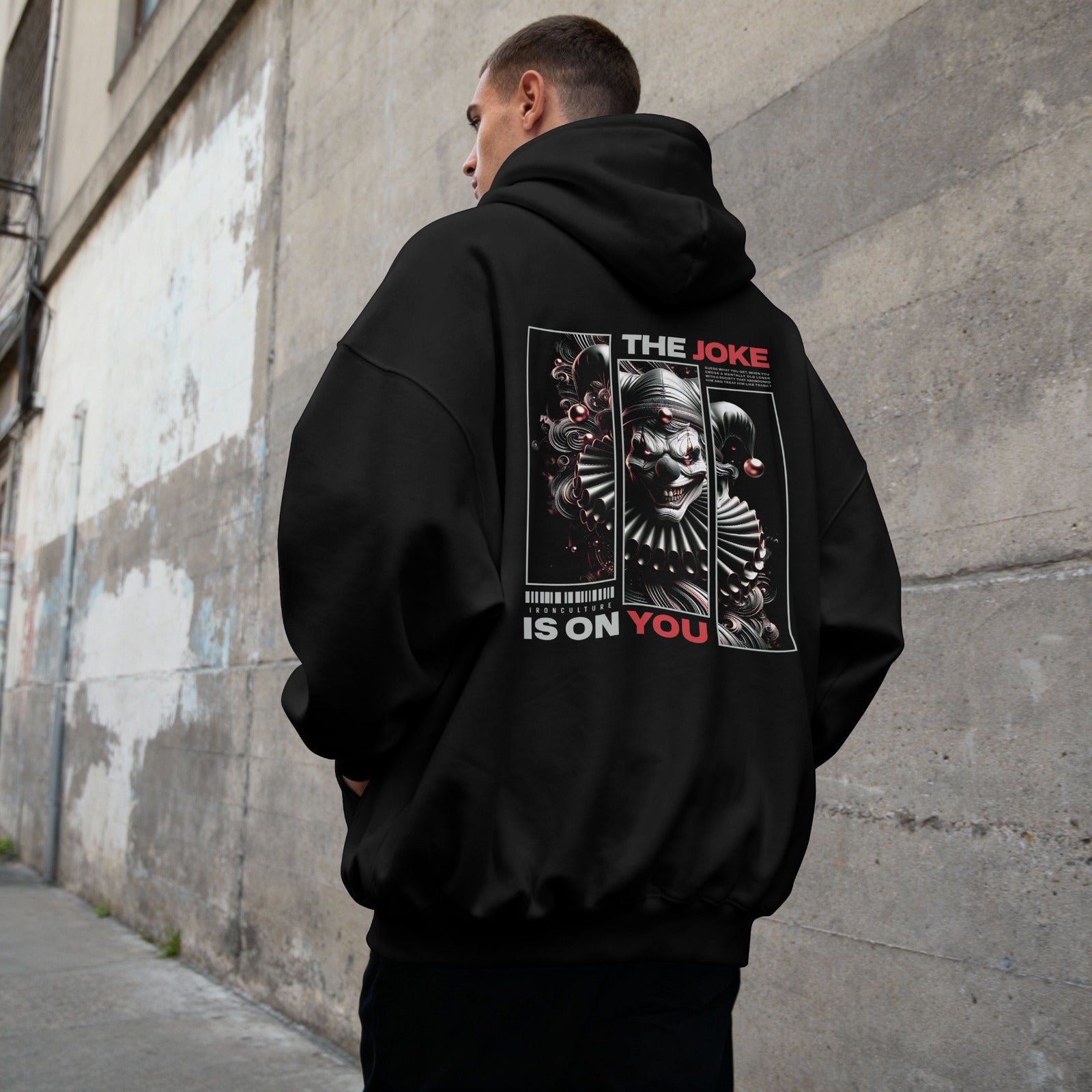 This premium oversized hoodie carries a cinematic dark aesthetic — twisting carnival chaos and psychological edge into wearable art.